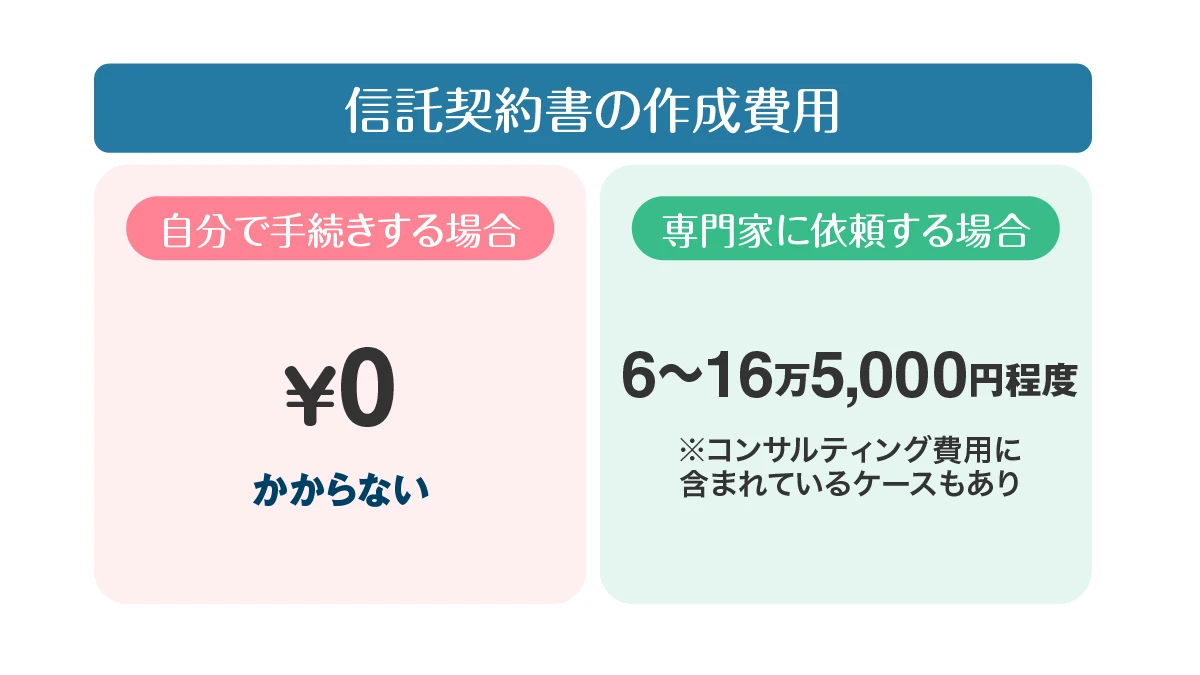 ただし、信託契約書の作成費用として6万〜16万5,000円程度の費用が発生するのが一般的です。なお、前述のコンサルティング費用に含まれているケースもあるため、見積書などで確認すると良いでしょう。