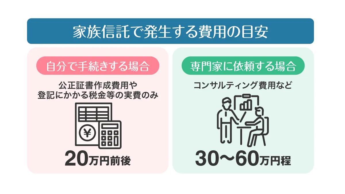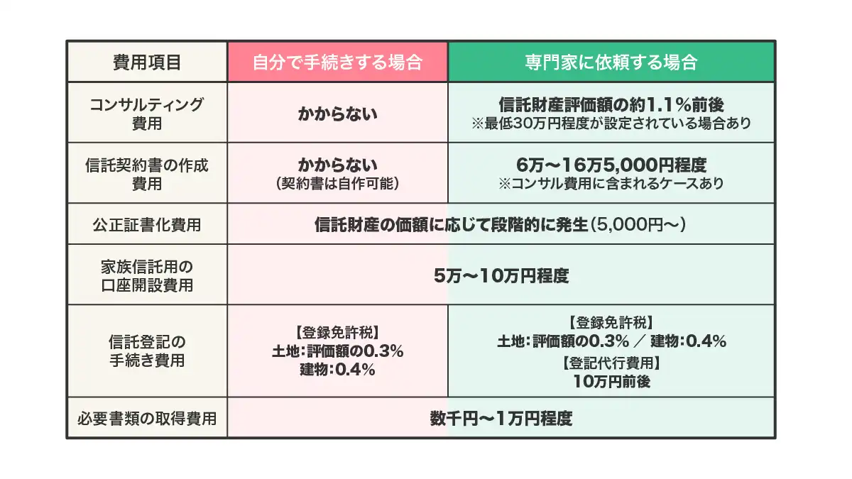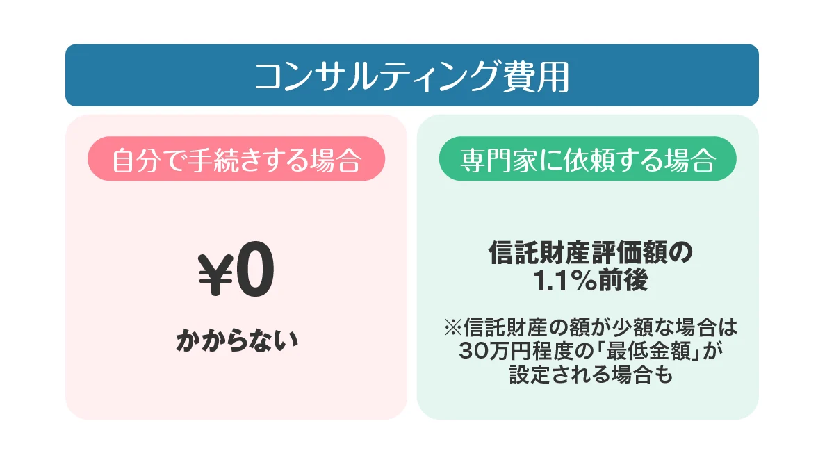 一方、自分で手続きを行う場合は、コンサルティング費用や信託契約書の作成費用を抑えられ、11万3,000円程度が目安となります。