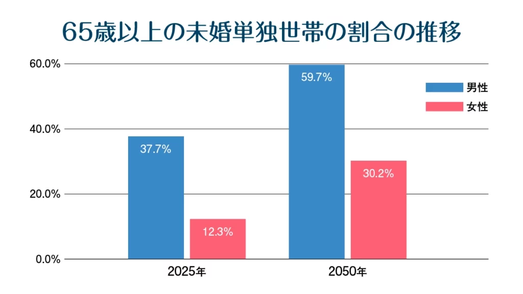 国立社会保障・人口問題研究所が公表した「日本の世帯数の将来推計(全国推計)(R6(2024)年推計)」によると、身寄りがない高齢者は増加傾向にあります。2050年における65歳以上の単身世帯のうち未婚者の割合は、男性が59.7%、女性が30.2%に達する見込みです。子どもや兄弟姉妹に頼れない人がふえることで、今後「身寄りがない」とされる高齢者は一層増えるでしょう。