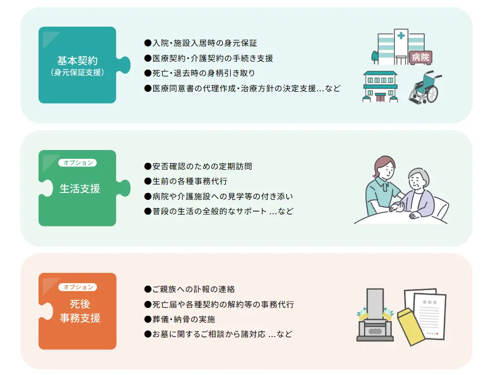 入院や施設への入居に必要な身元保証だけでなく、医療契約や介護契約の手続き支援や緊急時のかけつけまで幅広いケースに対応しています。
