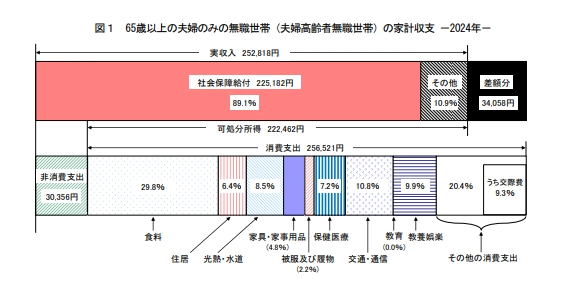 「家計調査報告〔家計収支編〕2024年(令和6年)平均結果の概要」(※1)によると、65歳以上の夫婦のみの無職世帯では、毎月の実収入は約25万円で、その大半を社会保障給付(公的年金など)が占めています。