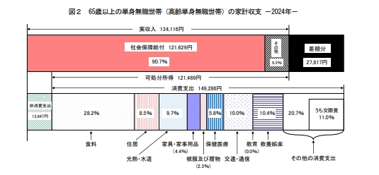 65歳以上の単身無職世帯における合計支出は16万1,933円で、そのうち非消費支出を除いた消費支出は14万9,286円です。