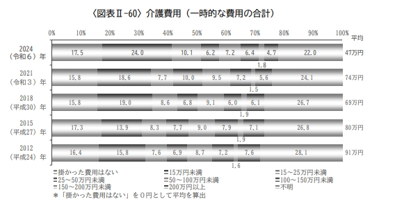 生命保険文化センター「生命保険に関する 全国実態調査」(2024年度)によると、介護にかかった一時的な費用は、年間平均47万円、1か月あたり約9万円となっています。(※6)