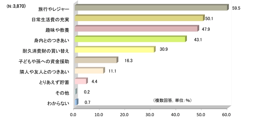 旅行やレジャー、日常生活費の充実、趣味や教養などが高い割合を占めています。